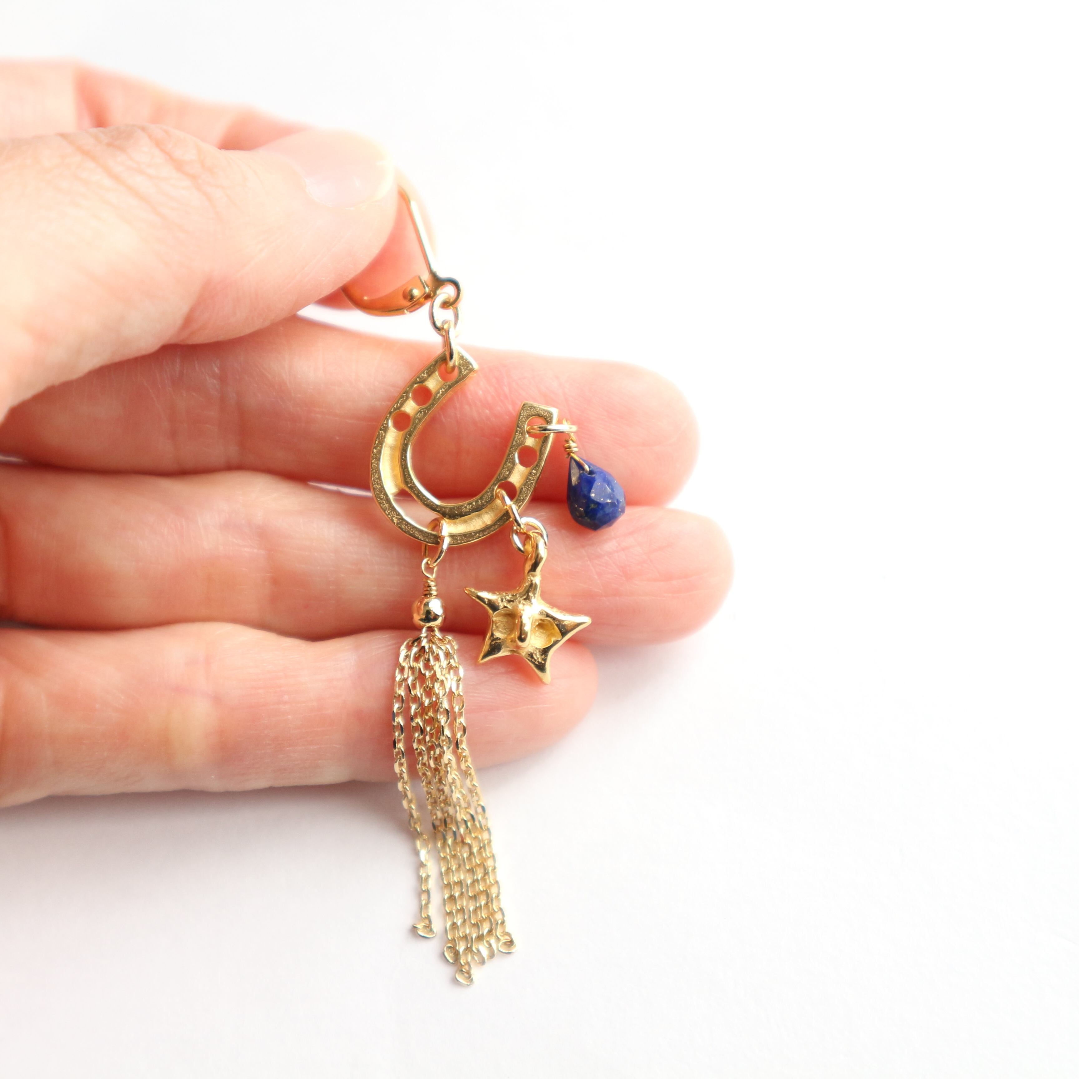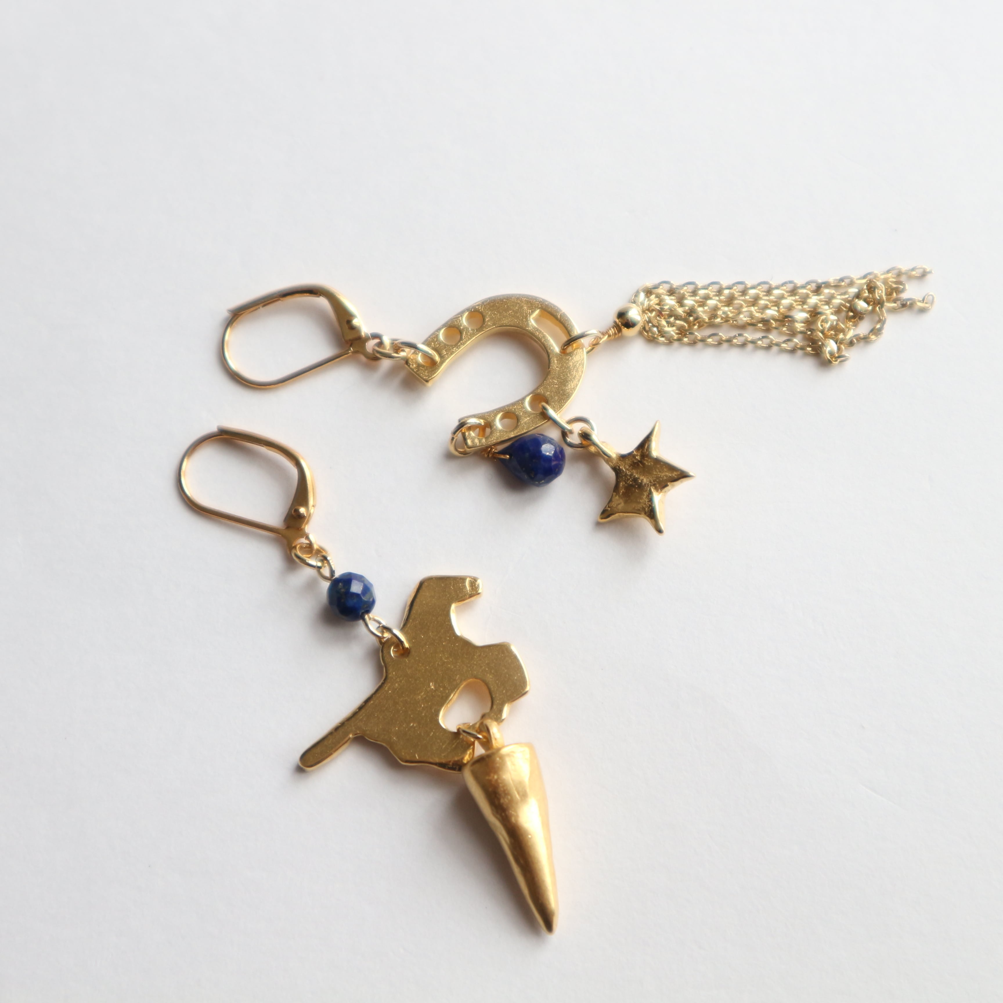 アシンメトリーで馬と蹄鉄、星、夜空の色を表すラピスラズリ、