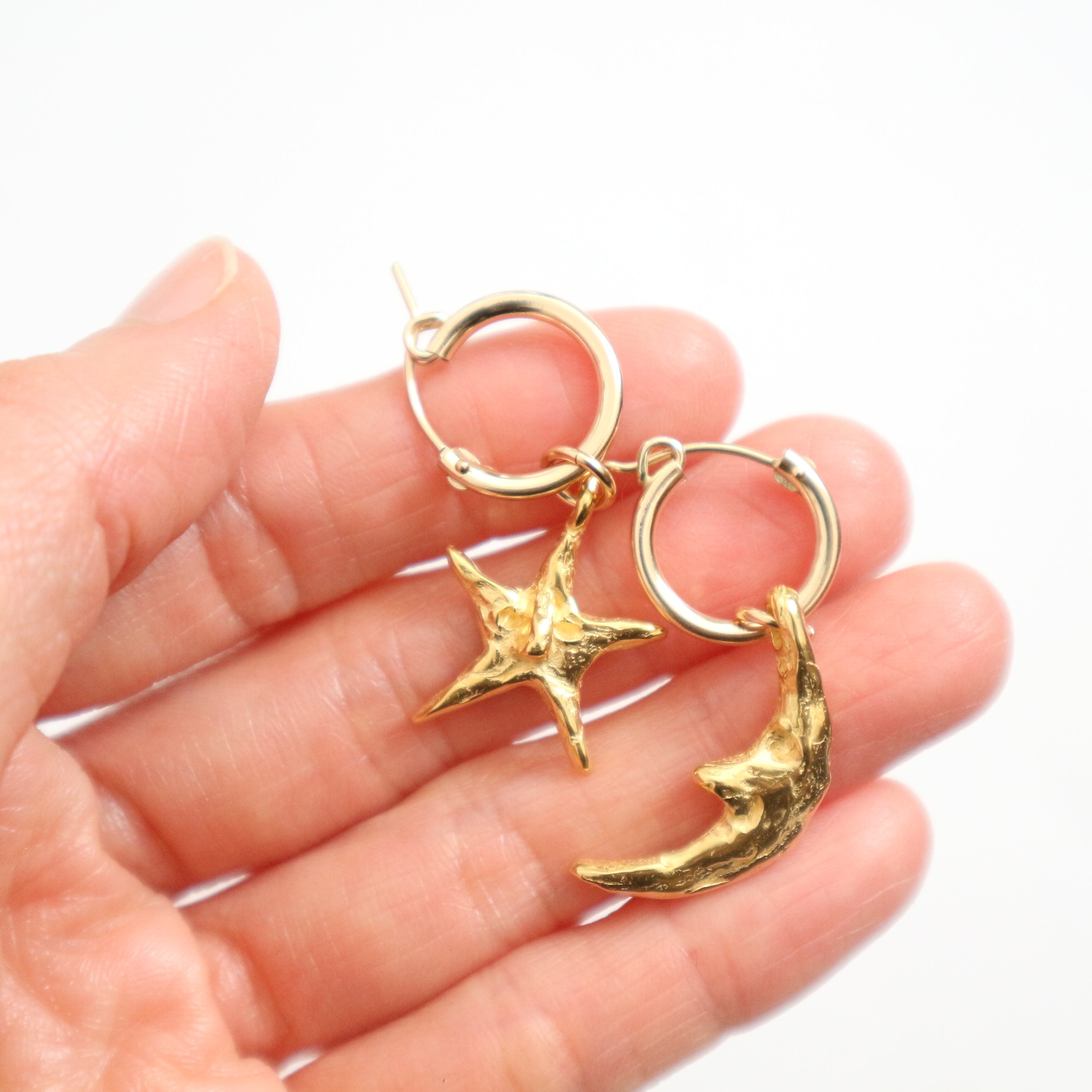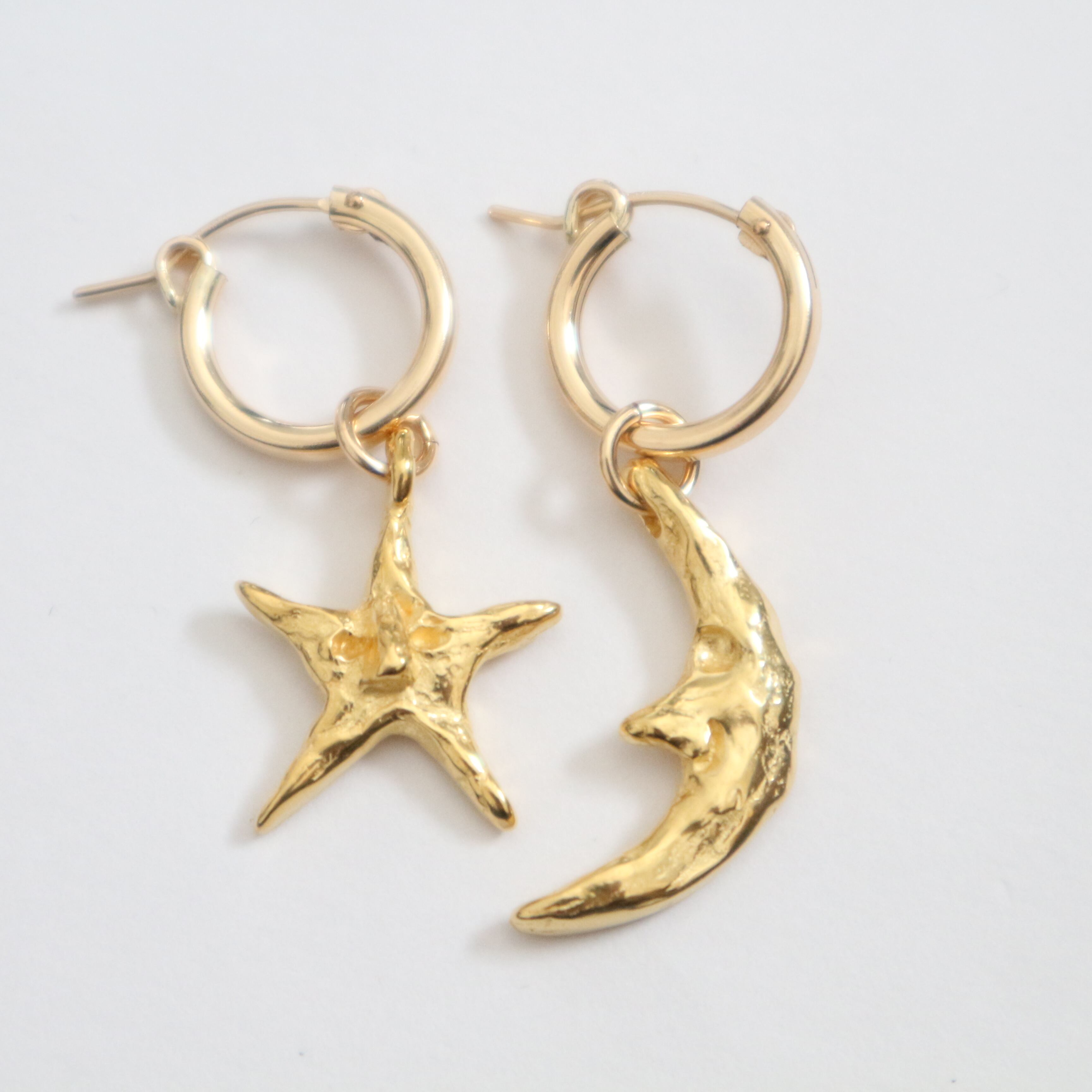 顔のある星と三日月のアシンメトリーデザインのピアスです。