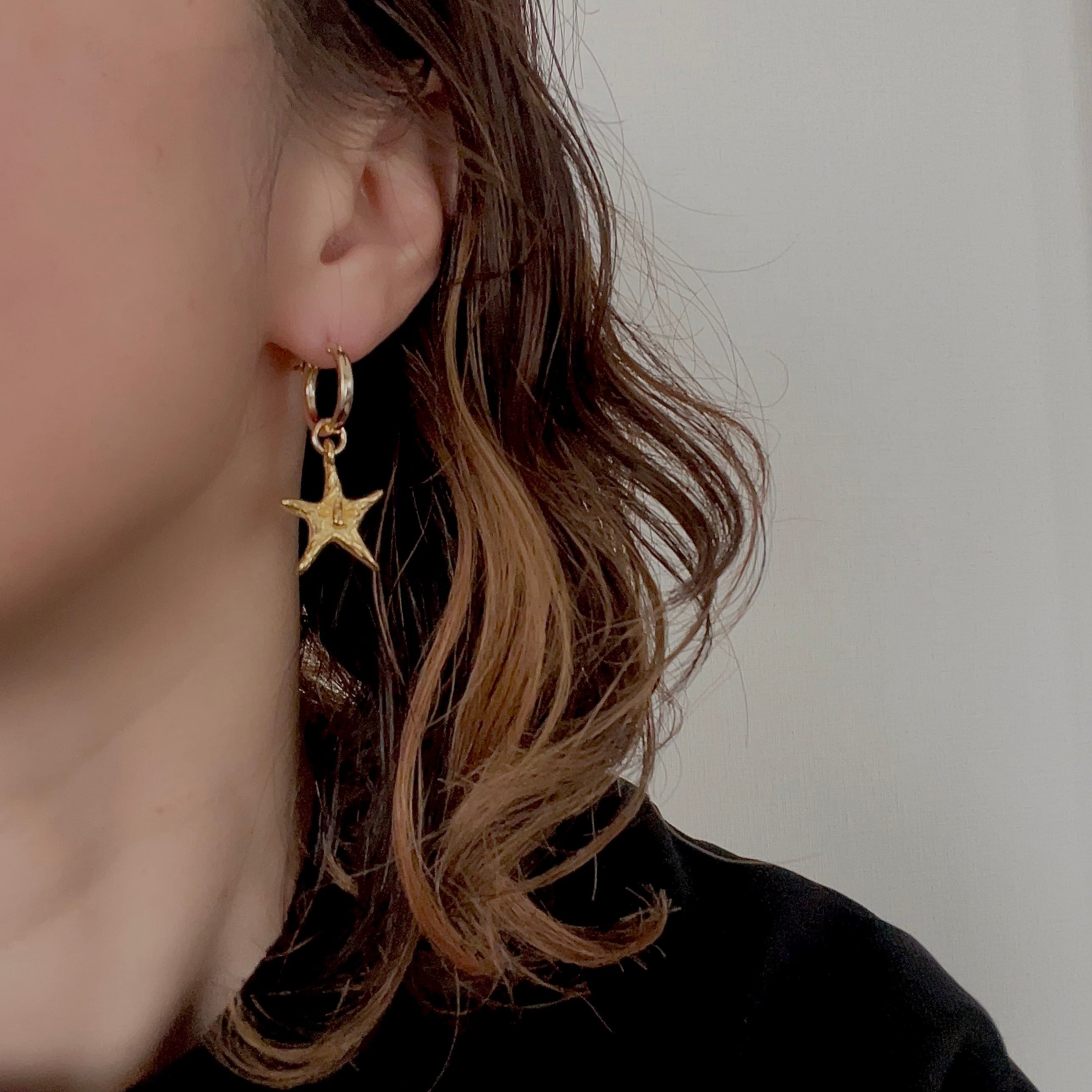 太めのフープのピアスにぶら下げることで、しっかりとメタル感を感じることができます。